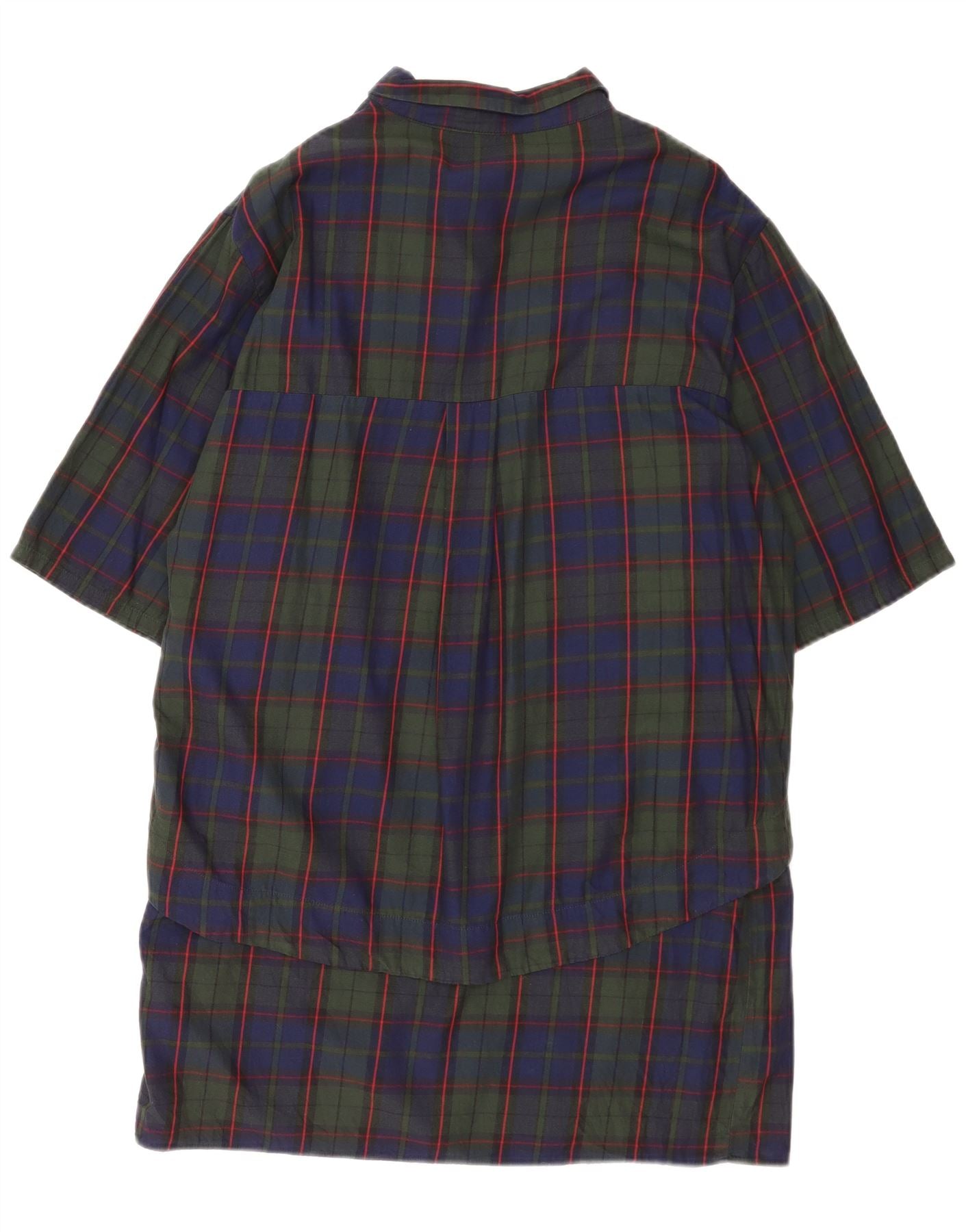 - Descrizione dell'IA: Questa camicia da donna Zara è realizzata in tessuto intrecciato, offrendo una sensazione confortevole. Presenta un classico motivo scozzese nei toni del verde, blu navy e rosso. Lo scollo con colletto e l'abbottonatura frontale forniscono una silhouette tradizionale. Le maniche corte e la vestibilità comoda garantiscono facilità d'uso. I pulsanti tonali completano il design, aggiungendo una sottile raffinatezza. Questa camicia offre un'estetica versatile e casual.