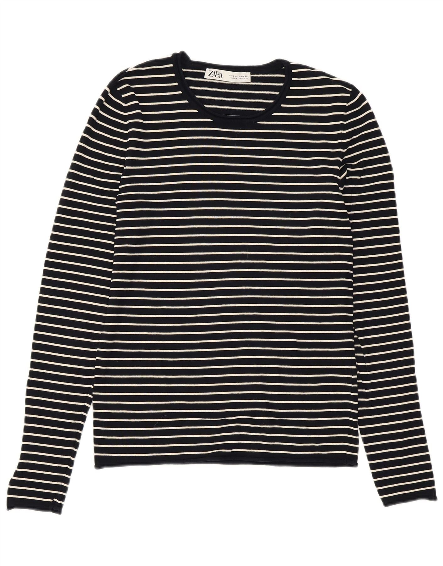 ZARA Maglione Girocollo da Donna UK 14 Grande Viscosa a Righe Blu Navy