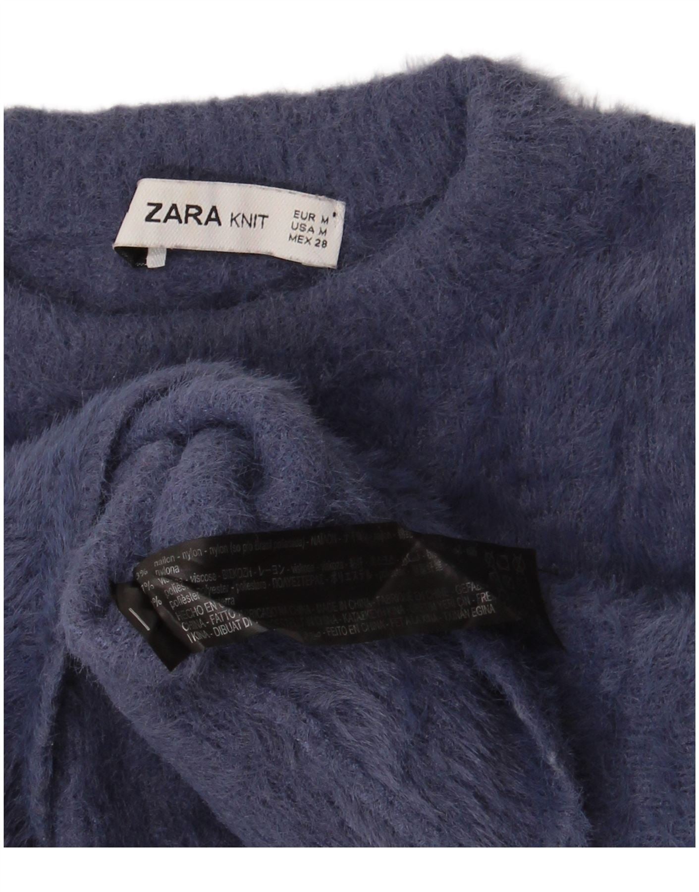 - Descrizione dell'IA: Questo maglione da donna Zara è realizzato in morbida e soffice maglia di nylon e viscosa in una ricca tonalità blu. Presenta un classico scollo rotondo e maniche lunghe con comodi polsini risvoltati. Il design pullover offre una vestibilità regolare per un'usura senza sforzo. Il suo stile moderno fornisce sia calore che una finitura tattile.