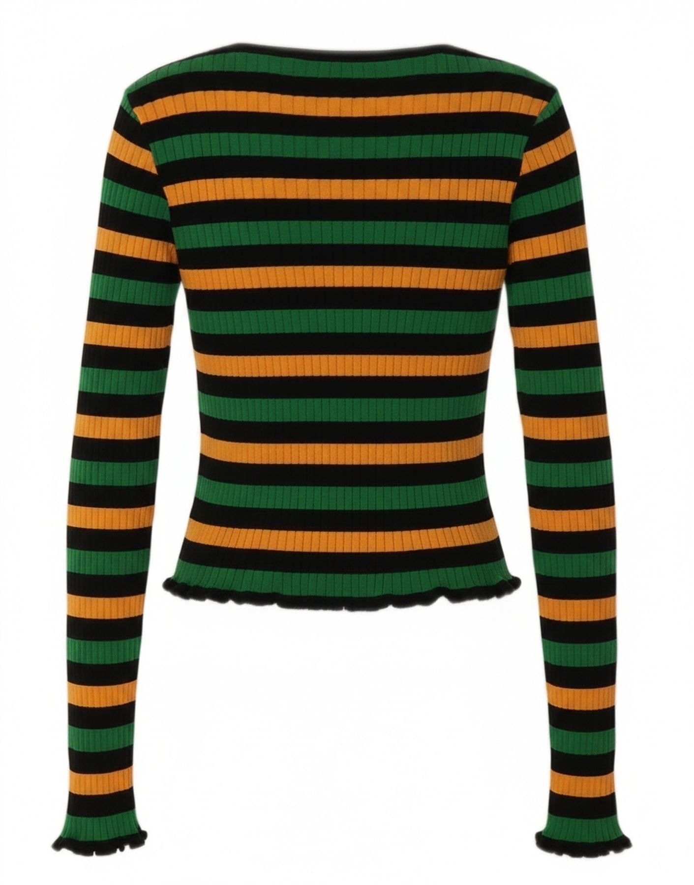 - Descrizione dell'IA: Questa maglietta da donna Zara è realizzata in comodo jersey lavorato a maglia multicolore. Presenta un vivace motivo a strisce in verde, arancione e nero. Lo scollo rotondo e le maniche lunghe offrono una silhouette classica. La vestibilità slim e la lunghezza corta gli conferiscono un tocco moderno. I sottili volant sui polsini e sull'orlo aggiungono un tocco giocoso. Questo stile pullover è perfetto per un look ispirato agli anni '90.