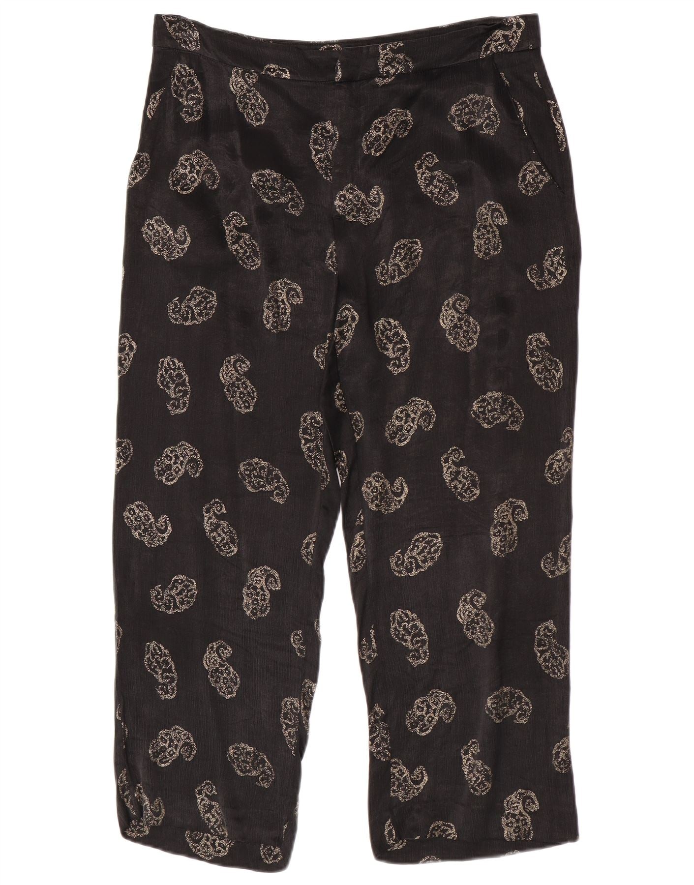 - Descrizione dell'IA: Questi pantaloni cropped da donna Zara sono realizzati in tessuto di rayon liscio nero. Presentano un intricato motivo paisley ovunque. La vita a vita media e la chiusura con zip garantiscono una vestibilità ordinata. Una vestibilità regolare sulla gamba offre comfort e stile. Pratiche tasche sono incluse per comodità. La lunghezza corta offre una silhouette moderna e versatile.