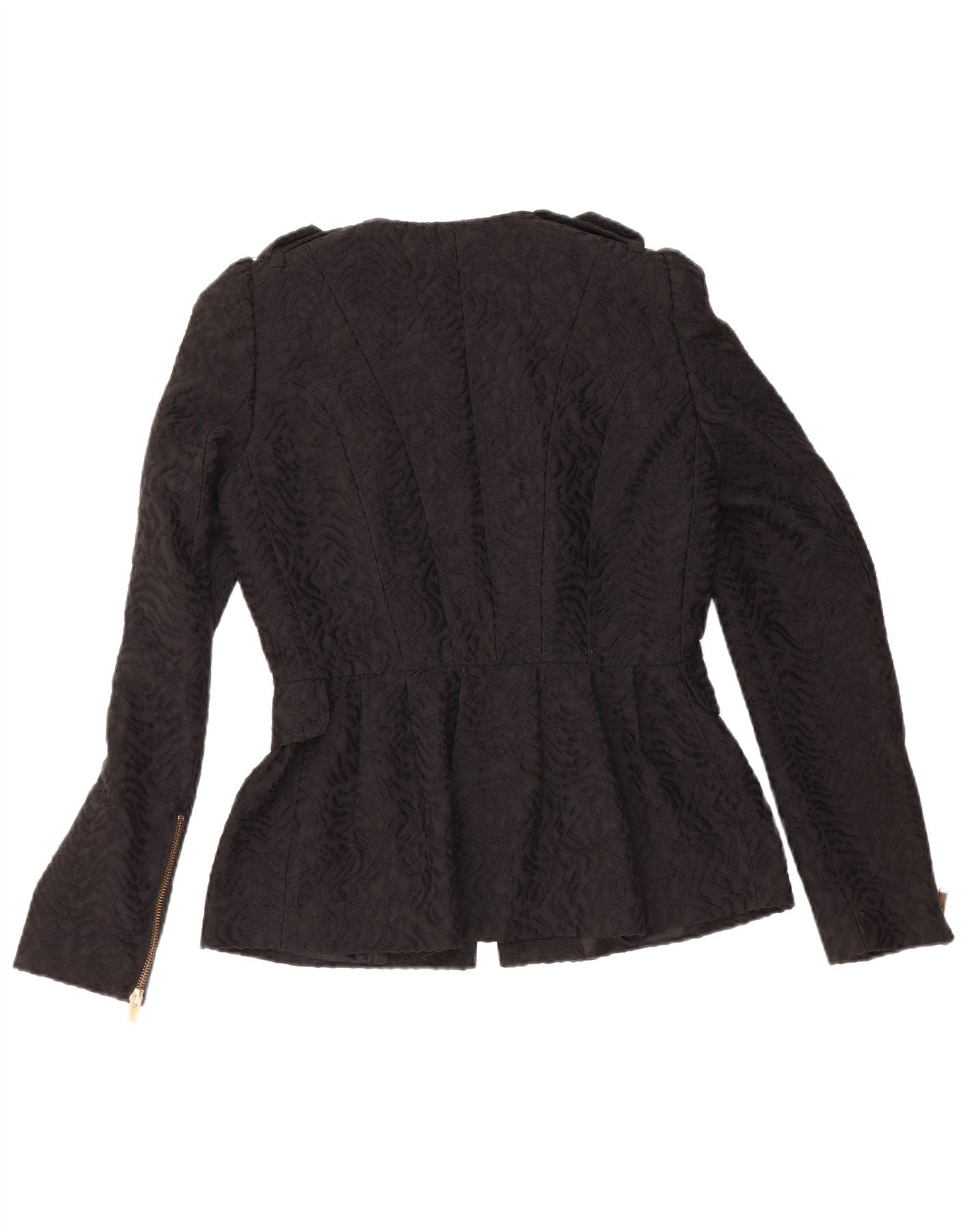 - Descrizione dell'IA: Questa giacca militare da donna Zara è realizzata in jacquard di viscosa nera, che offre una finitura ricca e strutturata. Presenta girocollo e maniche lunghe. La chiusura full zip corre lungo la parte anteriore. Bottoni decorativi color argento adornano la parte anteriore e le spalle, aggiungendo un caratteristico accento militare. L'orlo peplo crea una silhouette lusinghiera. E' completamente foderato e comprende pratiche tasche. La vestibilità regolare garantisce una vestibilità comoda.