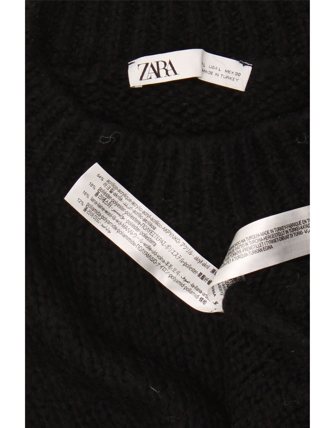 - Descrizione dell'IA: Questo maglione da donna Zara è realizzato in una comoda maglia in misto acrilico nero. Presenta un collo alto e un design classico a pullover. Le maniche a 3/4 e la lunghezza corta offrono una silhouette moderna. La sua vestibilità regolare assicura comfort e versatilità. Questo capo combina calore con un taglio contemporaneo ed elegante.